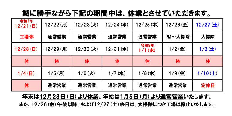 誠に勝手ながら、令和7年12月28日(日) から 令和8年1月4日(日)の間、休業いたします。